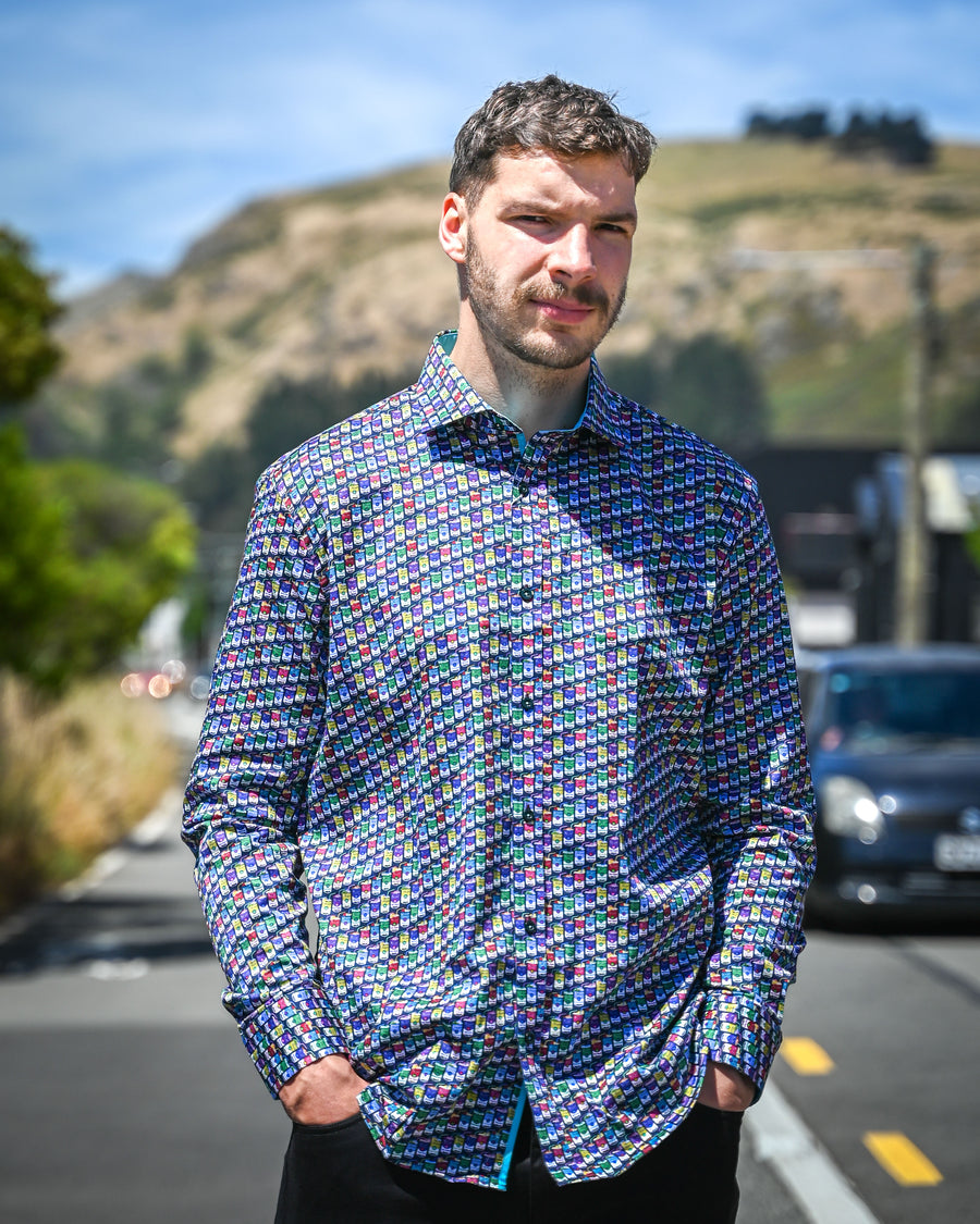 A stylish long-sleeve cotton shirt by Jimmy Fox with a cocktails motif.