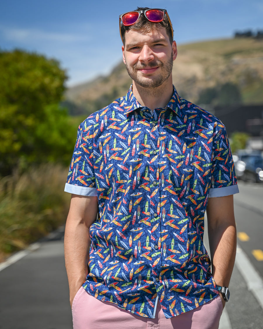 A stylish short-sleeve cotton shirt by Jimmy Fox featuring a surf board motif and contrasting pale blue cuffs.