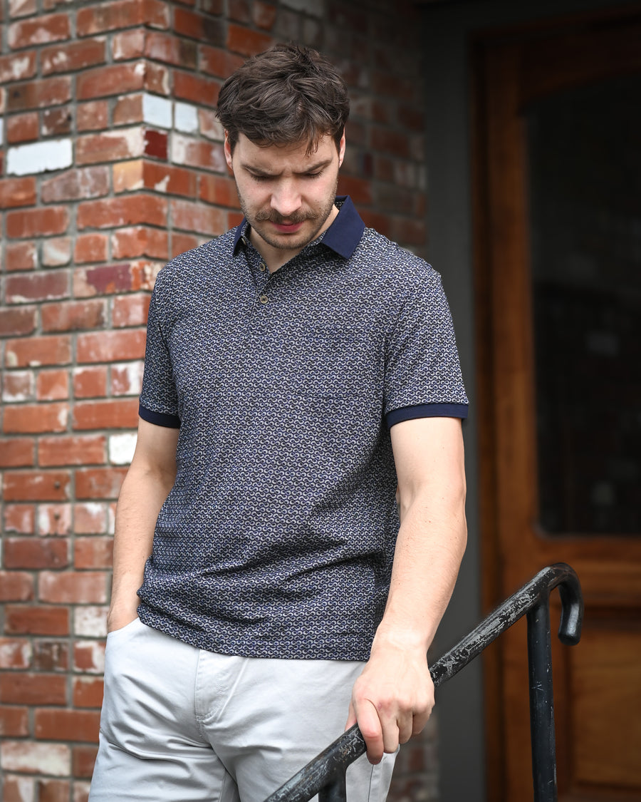 A short-sleeve navy patterned polo shirt by by Lifestyle.