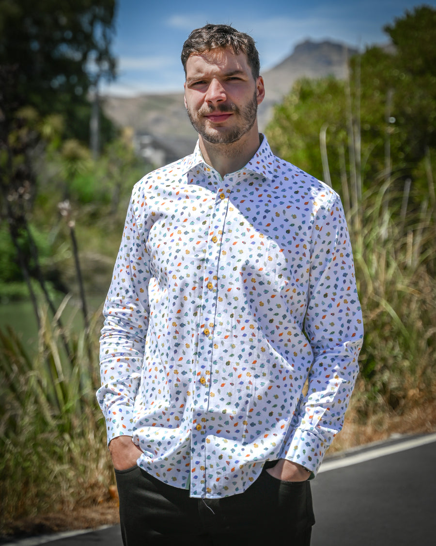 A stylish long-sleeve cotton shirt by Jimmy Fox with a tropical fish motif.